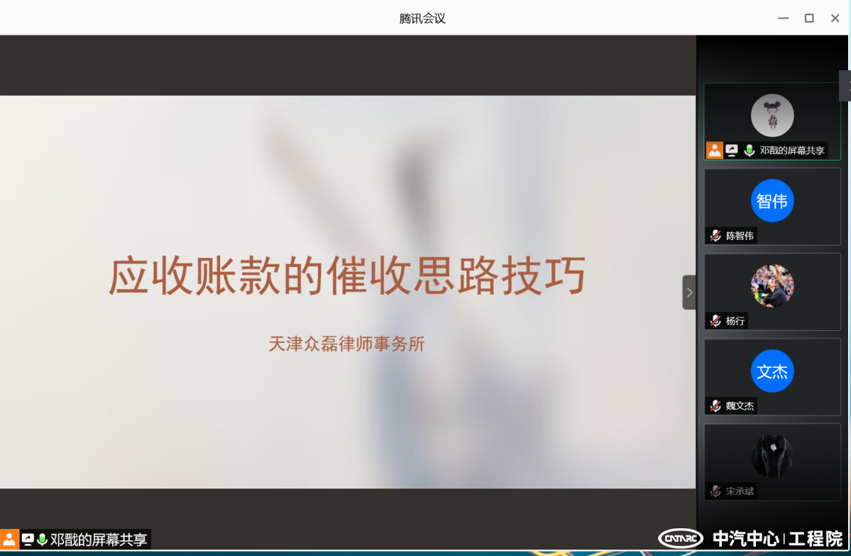 2020年11月18日下午,中汽研(天津)汽車工程研究院有限公司(簡稱“工程院”)組織了“應(yīng)收賬款催收技巧”的專題培訓。培訓特別邀請到了天津眾磊律師事務(wù)所劉俊律師做主講,工程院各市場經(jīng)理、部門BD、業(yè)務(wù)經(jīng)理、應(yīng)收賬款專員及法務(wù)人員等32位員工通過線上和線下的形式同步參加。