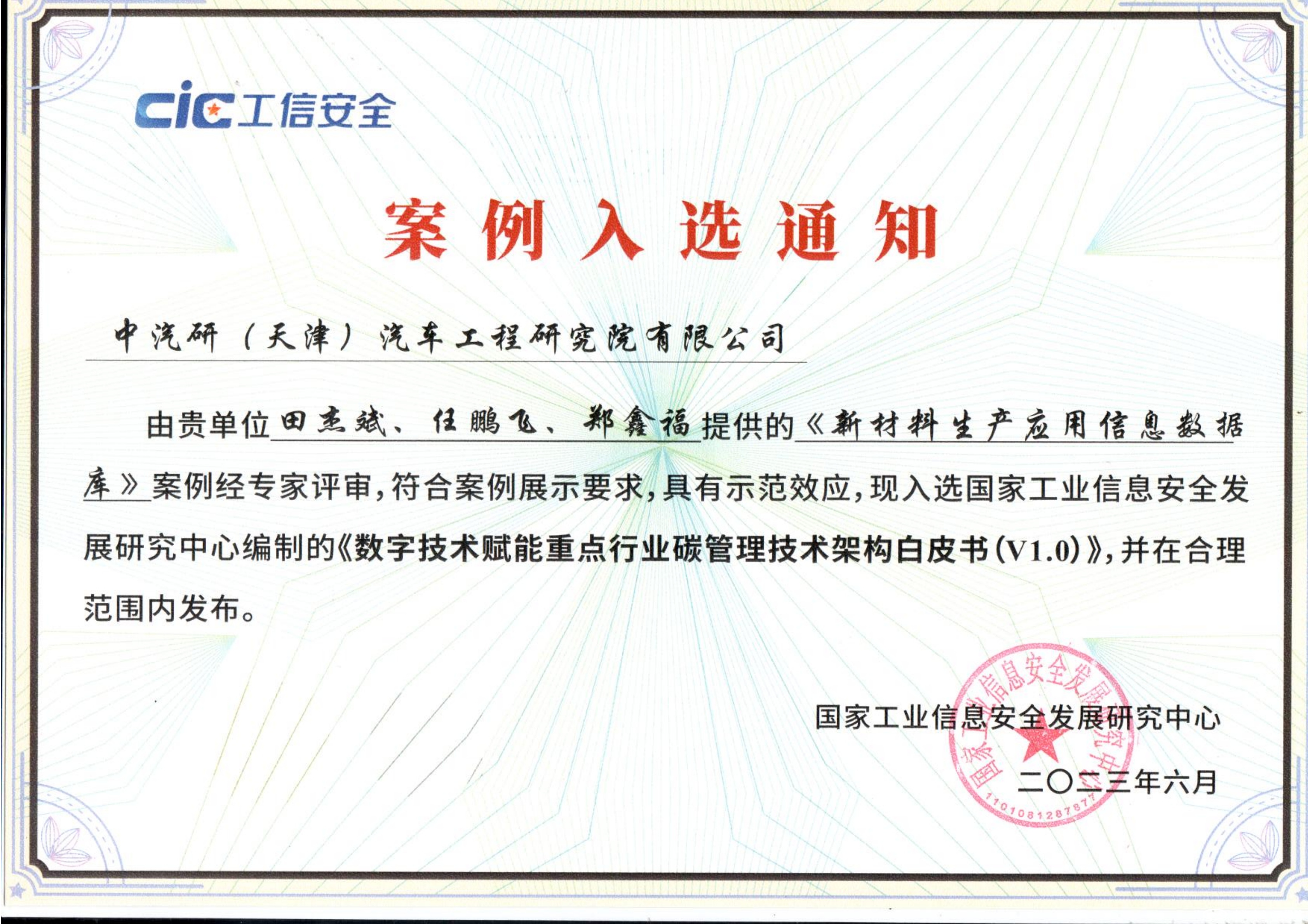 由中汽研(天津)汽車工程研究院有限公司(以下簡稱中汽中心工程院)申報的《新材料生產應用信息數據庫》案例經專家評審,符合案例展示要求,具有示范效應,成功入選國家工業信息安全發展研究中心編制的《數字技術賦能重點行業碳管理技術架構白皮書(V1.0)》。