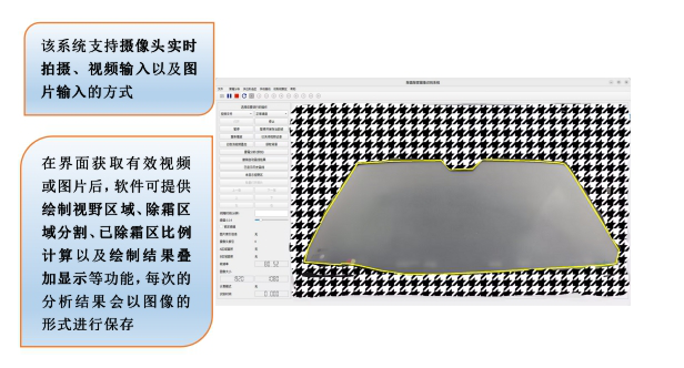 除霜分析系統不僅支持實時的顯示與計算分析,還支持試驗錄像,通過錄像分析也可以使用分析軟件的所有功能。一方面,該系統可同時錄制來自多個攝像頭的視頻流;另一方面,也可錄制特定視頻的分析和處理結果。此外,在繪制視野區后,除霜分析系統可以計算并顯示已除霜區域占各個視野區的比例,分析結果同樣以圖像的形式保存在相應的文件夾中。