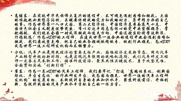 支部黨員結合自己的工作實際,圍繞國家命運、黨員責任、職業追求分享學習感想。高繼東同志表示,在實現中華民族偉大復興的進程中,不可避免遇到困難和挑戰。在以習近平同志為核心的黨中央堅強領導、掌舵領航,我們絕不會因一時風浪挑戰而迷失方向,中國這艘巨輪將劈波斬浪、行穩致遠!作為工程院的工程師,在建成世界一流企業的進程中也會遇到困難和挑戰,我們要攻堅克難,把自己的業務領域做精做專,做到行業領先,為工程院成為世界一流工程研發機構而不懈努力。支部書記方銳指出,汽車產業是國民經濟的重要支柱產業,面臨經濟發展新常態,國內汽車產業轉型升級的新時期,也是實現汽車強國的戰略機遇期,我們汽車研發工程師一定要立足本職工作,瞄準科技前沿,聚焦共性關鍵技術,勇于攻堅克難,全面貫徹實施創新引領。