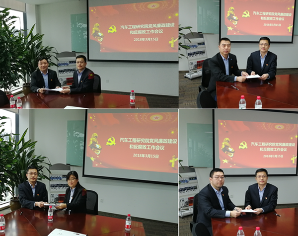 2018年3月15日,汽車工程研究院召開黨風廉政建設和反腐敗工作會議,貫徹落實中汽中心黨風廉政建設和反腐敗工作會議精神及中汽中心紀委2018年工作要點文件要求,部署2018年黨風廉政建設和反腐敗工作任務。工程院黨總支書記、黨總支委員及各部門副科級以上領導干部參加會議,會議由黨總支副書記馬杰主持。