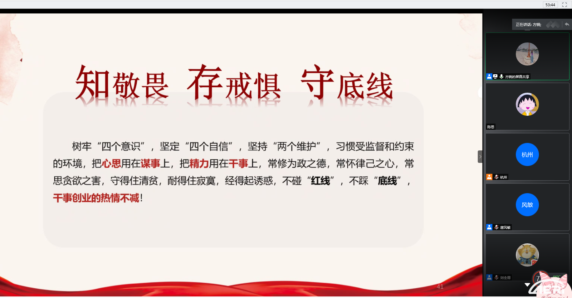 首先,方銳同志帶領(lǐng)參會黨員逐條學習《中國共產(chǎn)黨紀律處分條例》(簡稱“條例”),重點解讀“條例”中有關(guān)違紀處分的相關(guān)規(guī)定,通過以案釋法的方式生動解讀相關(guān)規(guī)定。方銳同志強調(diào),基層支部要深刻理解紀律建設的重要性,要以學習貫徹《中國共產(chǎn)黨紀律處分條例》為契機,進一步加強紀律建設,堅決對違規(guī)違紀行為“零容忍”,共同推動全體黨員和領(lǐng)導干部更好地知敬畏、存戒懼,守底線。