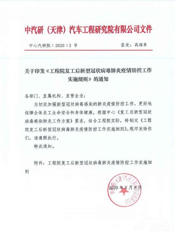 2月8日,發布《工程院復工后新型冠狀病毒肺炎疫情防控工作實施細則》,從人員復工、交通工具乘坐、個人防護、入院區防護、辦公防疫、就餐防疫、體溫檢測工作、各場所消毒工作、單身公寓防疫、客戶來訪、外來物品管理等11個方面對復工后防疫工作進行了全面、系統地部署。