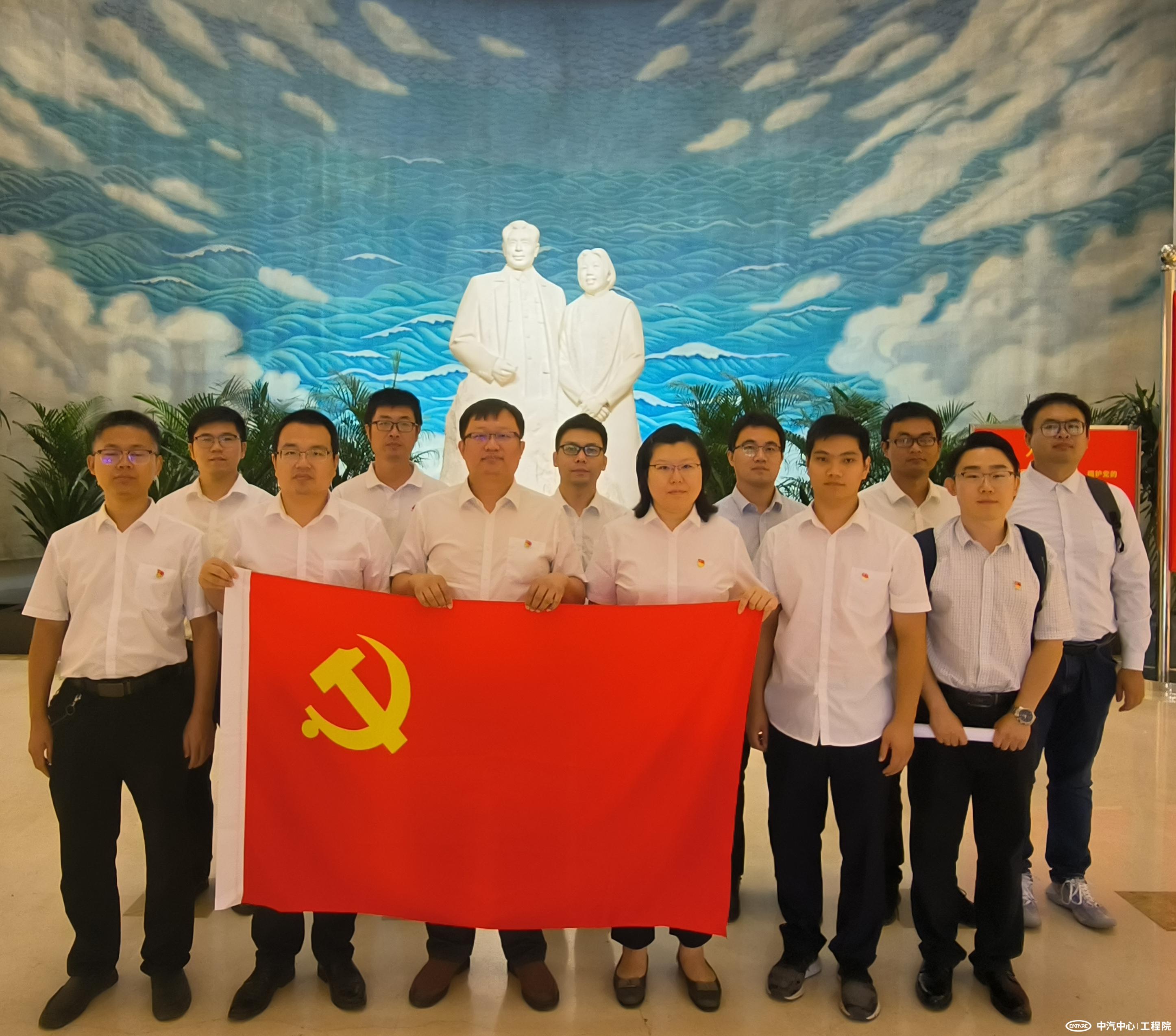 全體人員在周恩來、鄧穎超的漢白玉雕像《情滿江山》前與黨旗合影,一面旗幟,一種信仰,用最美的合影向黨表白。